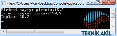 1 2 3 4 5 6 7 8 9 10 11 | static void Main(string[] args) { double sayi1=0, sayi2=0, toplam=0; Console.Write("Birinci sayıyı giriniz:"); sayi1 = Convert.ToDouble(Console.ReadLine()); Console.Write("İkinci sayıyı giriniz:"); sayi2 = Convert.ToDouble(Console.ReadLine()); toplam = sayi1 + sayi2; Console.WriteLine("Toplam= {0}",toplam.ToString()); Console.ReadKey(); } |